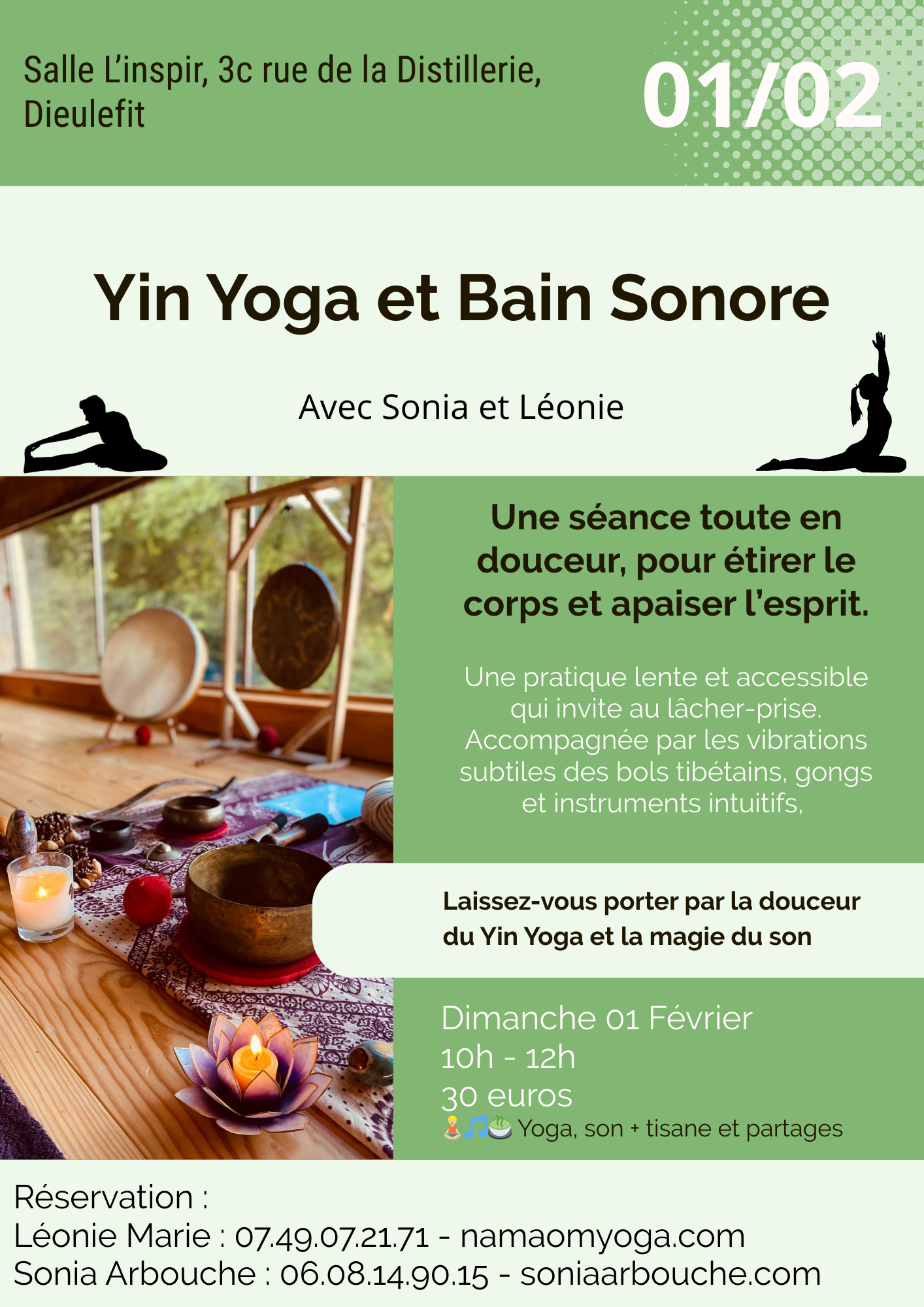 Voyage sonore et Yin Yoga avec Sonia Arbouche et Léonie Marie. Laissez vous bercer par l’harmonie des mouvements et des sons qui permet d’apaiser l’ensemble du corps et de l’esprit !