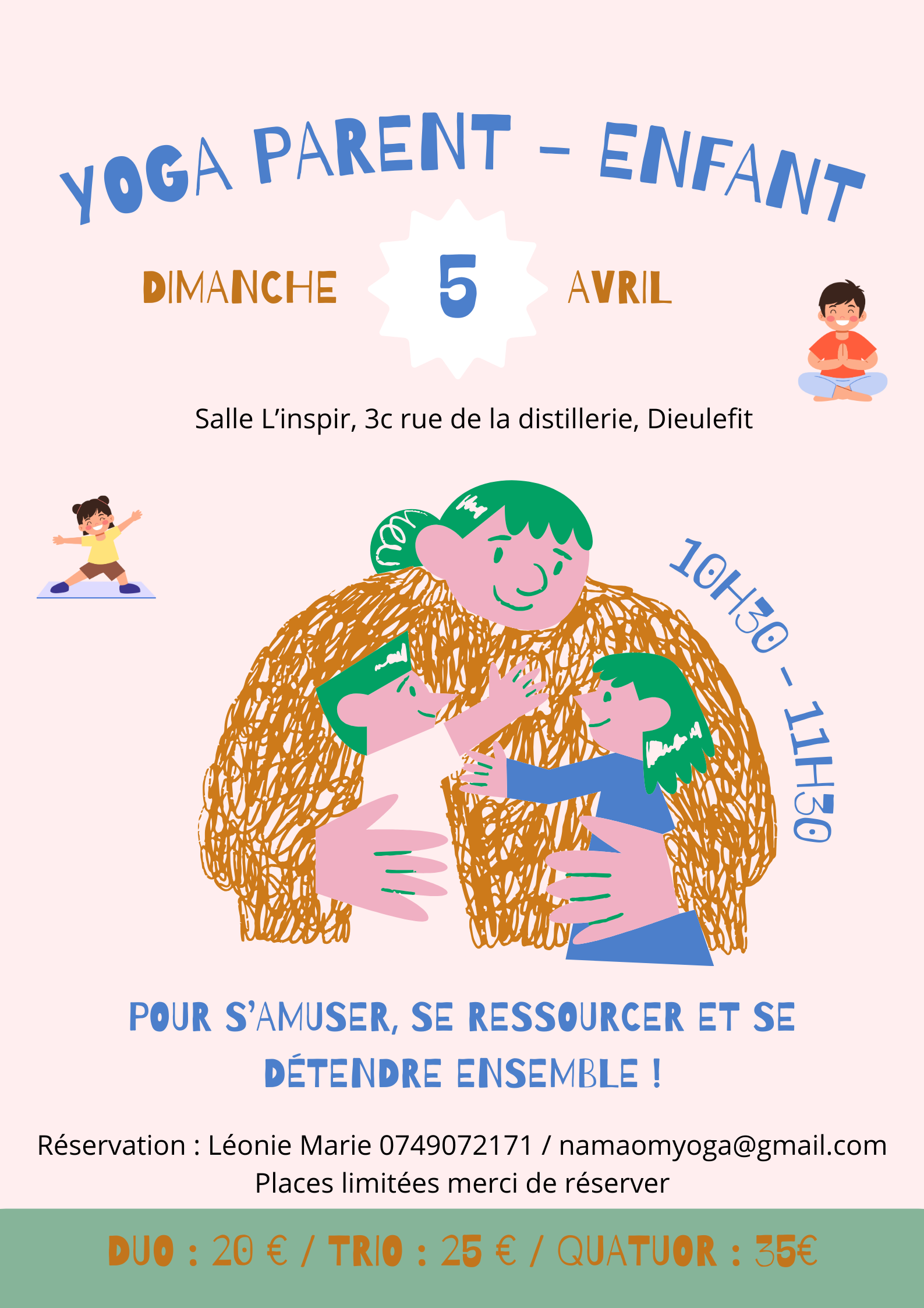 Léonie Marie, professeur de Hatha et Yin Yoga, titulaire du BAFA jeune enfant, assistante préélémentaire et certifiée en yoga pré et postnatal, je vous propose un atelier de yoga parent – enfant. Le yoga permet à l'enfant de s'apaiser ainsi que d'améliorer sa concentration, de mieux connaître son corps, canaliser son énergie, éloigner l'anxiété et bien sûr s'amuser !! L'atelier en duo permet un moment de partage dans le bien-être et la joie. Je vous propose des outils à utiliser à la maison. C’est une séance de yoga avec des postures, des respirations, des activités pour vous amuser, vous ressourcer et vous détendre ensemble. Le parent peut être un adulte autre que le papa - maman. ( mamie , oncle , marraine… )